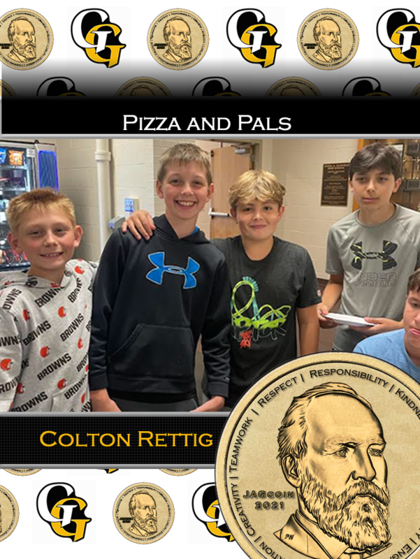 Congratulations to our JAGcoin Raffle winner Colton! Colton won Pizza w/ Pals at lunch this week from Domino's Pizza in Garrettsville. Keep up the great work in demonstrating our District's Core Values. It's a great time to be a G-Man. Go G-Men!